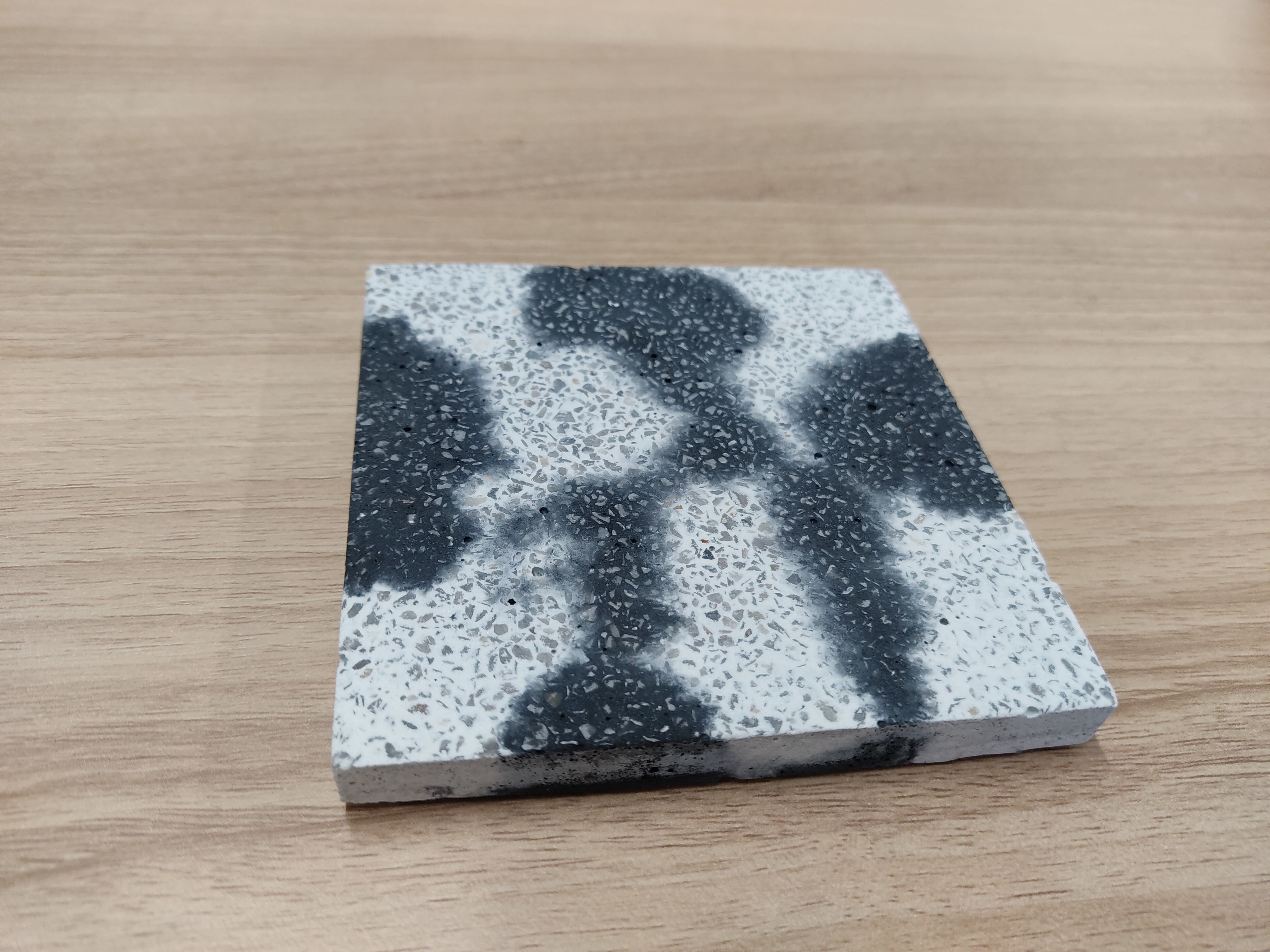 白セメントと黒に着色したセメントを《トントン製法》で混ぜたコースターです。