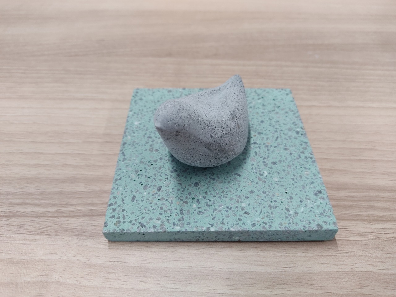 3Dプリンターで製作したシリコン型枠を利用し、二酸化炭素を取り込んだコンクリートで製作した小鳥です。